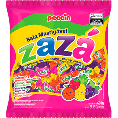 A Bala Zaza Peccin Sortidas 600g possui sabores sortidos de morango, abacaxi, laranja e uva, é mastigável e uma ótima opção para ser revendida em comércios.